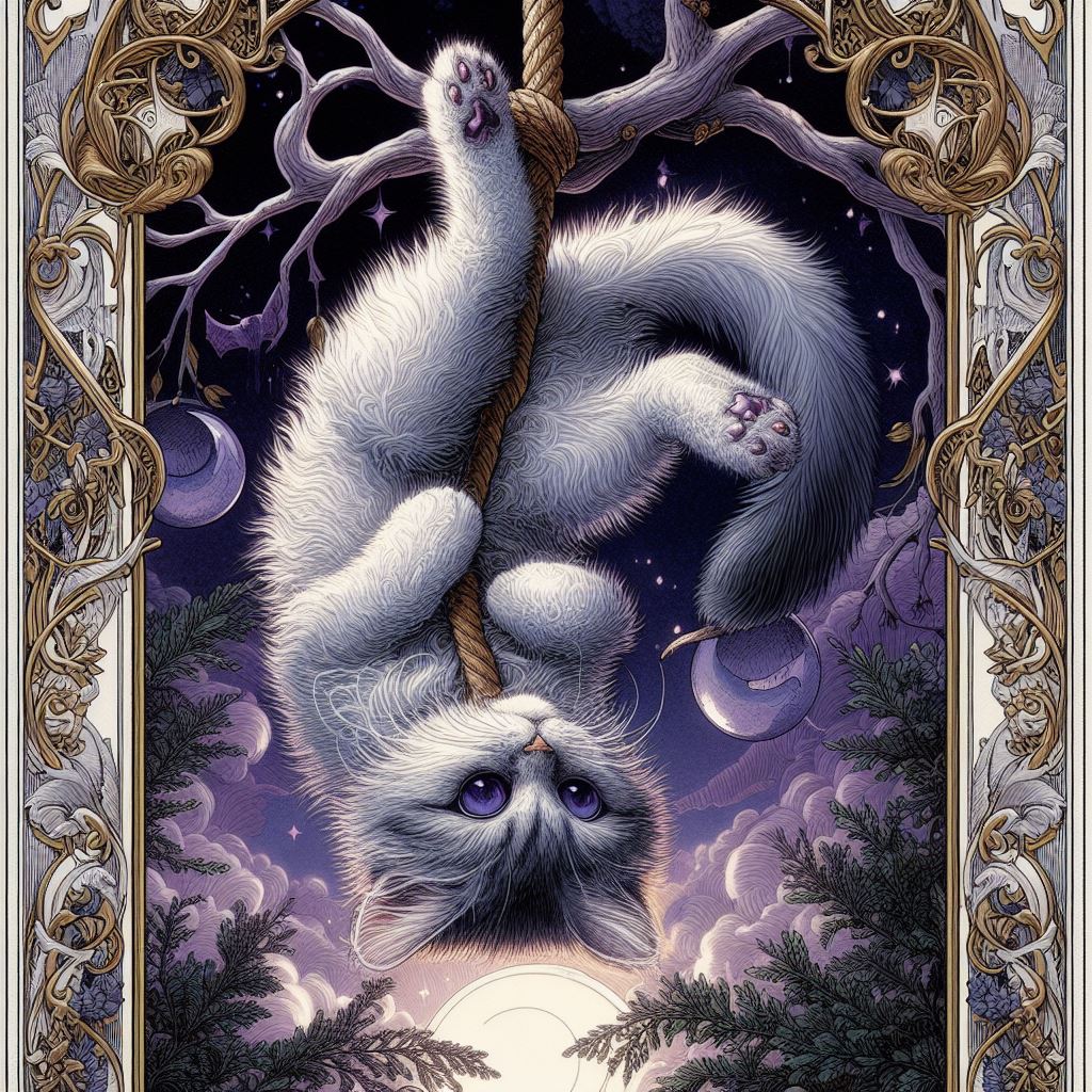 En el reino felino del Tarot, el Minino Colgado es como ese momento en el que te encuentras en una posición inusual, quizás boca abajo, mirando el mundo desde un ángulo completamente diferente. Es como cuando te subes a un lugar alto y ves tu hogar desde una nueva perspectiva. El Colgado te anima a ser valiente, a atreverte a ver las cosas de manera única, a desafiar la corriente común.