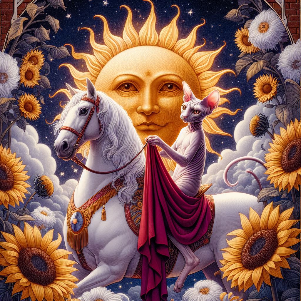 La esencia felina del Sol te invita a confiar en que el éxito está a tu alcance. Así como el gato confía en sus instintos para cazar y explorar, tú también puedes confiar en tu intuición y sabiduría interna para guiar tus pasos. La luz del Sol disipa las sombras, revelando oportunidades y caminos claros.