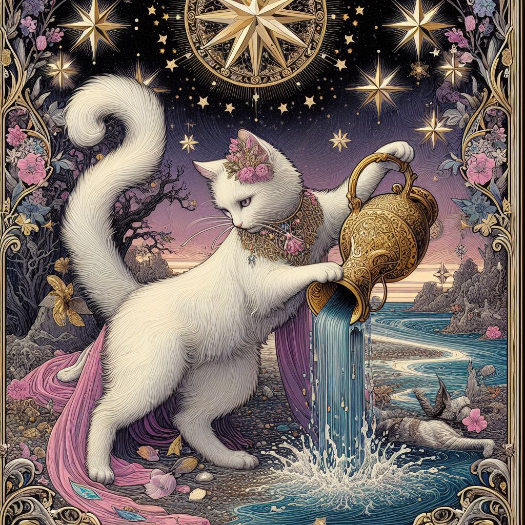 Observa la minina de la carta vertiendo agua en la tierra. Este acto simboliza la renovación y el ciclo de la fertilidad y la conexión a los siete chakras, así que su ronronee te invitan a abrir estos centros de energía vital para mantener tu equilibrio espiritual. Igualmente la estrella te hace el llamado a conectar cabeza y corazón, mantener siempre un pie en pie en el agua (tus emociones y tu intuición) y otro en la tierra (estabilidad); así lograras la la combinación perfecta para tu equilibrio diario