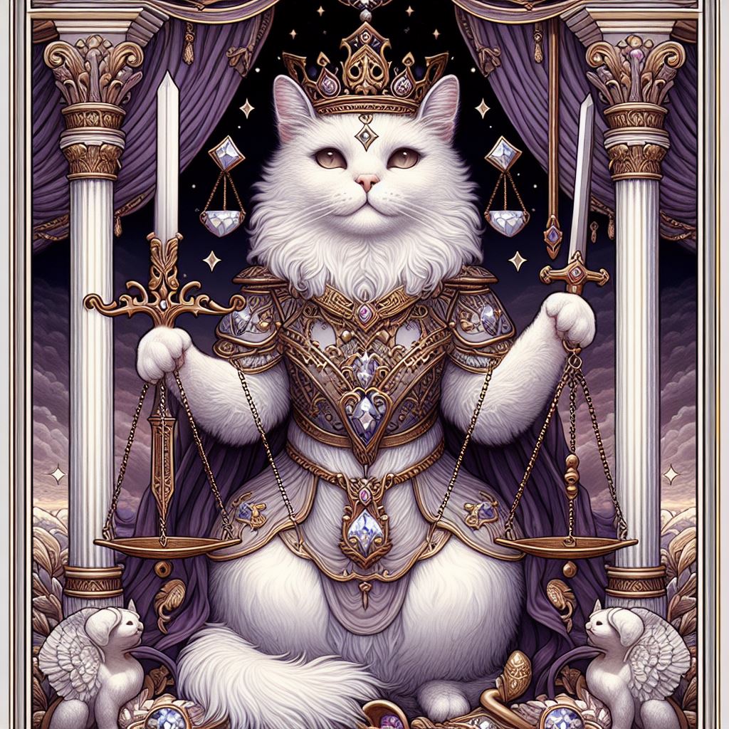 La Justicia, ese felino regente de las leyes del universo, maúlla en tu lectura para recordarte la danza eterna de causa y efecto que rige nuestras vidas.
